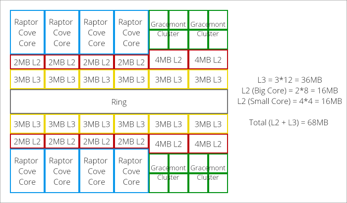 ● Raptor Lake Total Cache(L3+L2) = 68 MB
