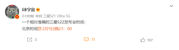 而今天,就有著名爆料博主@冰宇宙,曝光了三星Galaxy S22系列的具体发布时间。三星S22全球发布会将于北京时间2月9日23:00开始,对应的纽约时间则刚好是2月8日上午10:00,这也与此前流传的大致时间相一致。