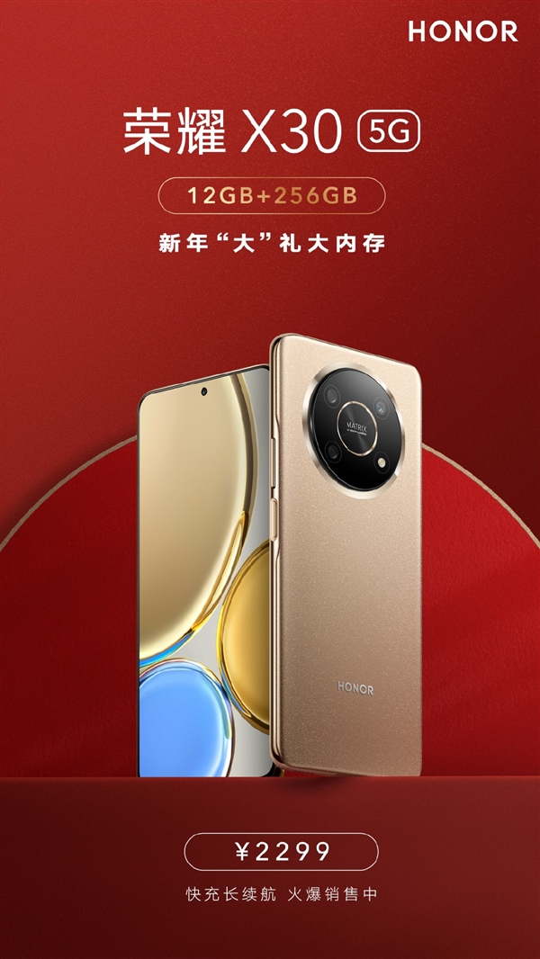 在农历新年即将到来之际,荣耀官方也带来了一份“大”礼,推出了荣耀X30超大内存版,️拥有12GB+256GB存储组合,售价为2299元,目前已经正式上架开售。
