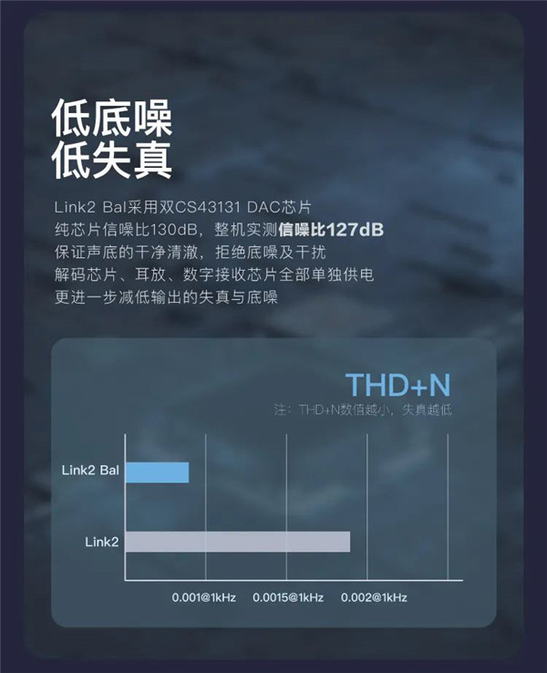 乂度 Link2 Bal 搭载两颗 CS43131 DAC 芯片,实测整机信噪比达到 127dB,底噪十分小。解码芯片、耳放、数字接受芯片全部单独供电,以减少干扰,降低失真。