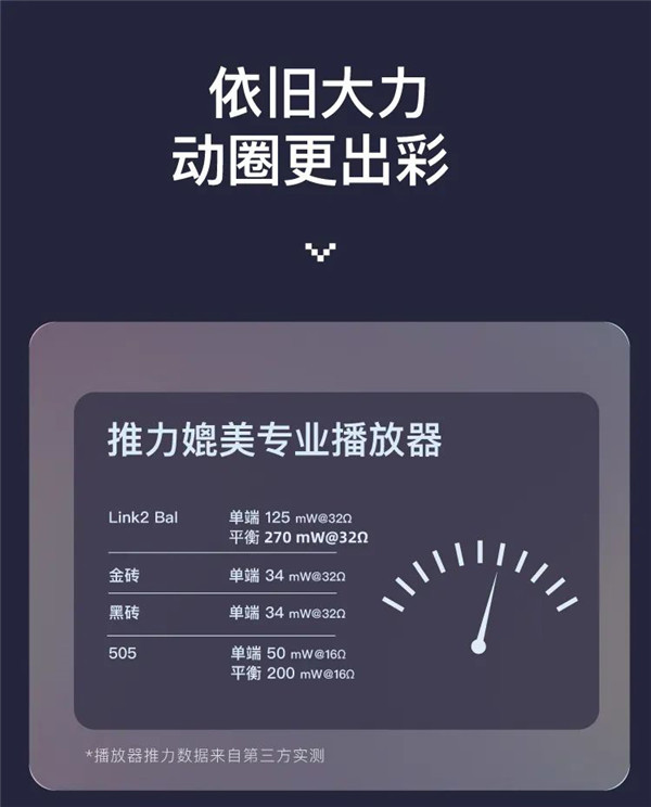 这款解码耳放内置大推力驱动电路,单端推力可达 125mW@32Ω,平衡口推力可达 270mW@32Ω。