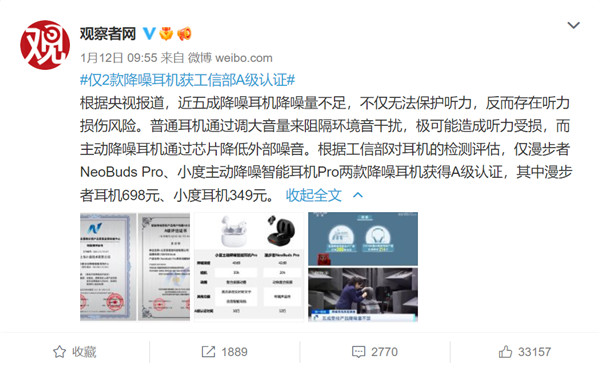 1 月 13 日消息,今日,“仅 2 款降噪耳机获工信部 A 级认证”登上热搜,消息来自观察者网的报道,称近五成降噪耳机降噪量不足,不仅无法保护听力。根据工信部对耳机的检测评估,仅漫步者 NeoBuds Pro、小度主动降噪智能耳机 Pro 两款降噪耳机获得 A 级认证。
