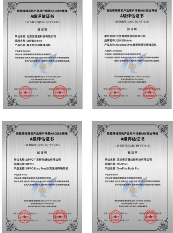 不过,查看国家工业信息安全发展研究中心官网于 12 月 24 日发布的文章发现,文章称,经测评,漫步者 TWS NB2、漫步者 NeoBuds Pro、OPPO Enco Free2i、OnePlus Buds Pro 共 4 款产品在测评中综合表现优异,获得智能降噪耳机产品用户场景 ANC 综合降噪 A 级评估证书。观察者网的报道可能是选取的去年 10 月份的报道。