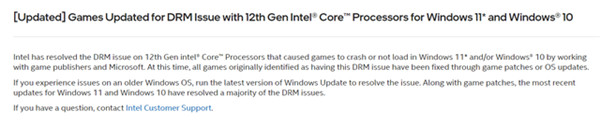 1 月 11 日消息,英特尔最近更新了其专门针对 Alder Lake DRM 问题的网站,确认所有已发现的游戏兼容问题已得到完全解决。