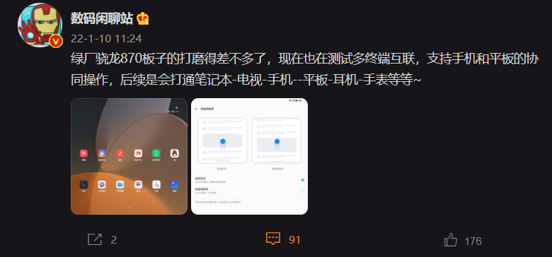 今日,数码博主 @数码闲聊站 发布了两张截图,表示该平板已经打磨得差不多了,搭载骁龙 870 处理器,支持 120Hz 高刷,正在测试多终端互联。