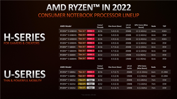 日前,AMD正式发布了锐龙6000H/6000U系列移动处理器,采用6nm工艺、Zen3+ CPU架构、RDNA2 GPU架构,还带来了升级版的锐龙5005U系列,仍然是7nm、Zen3、Vega的组合。