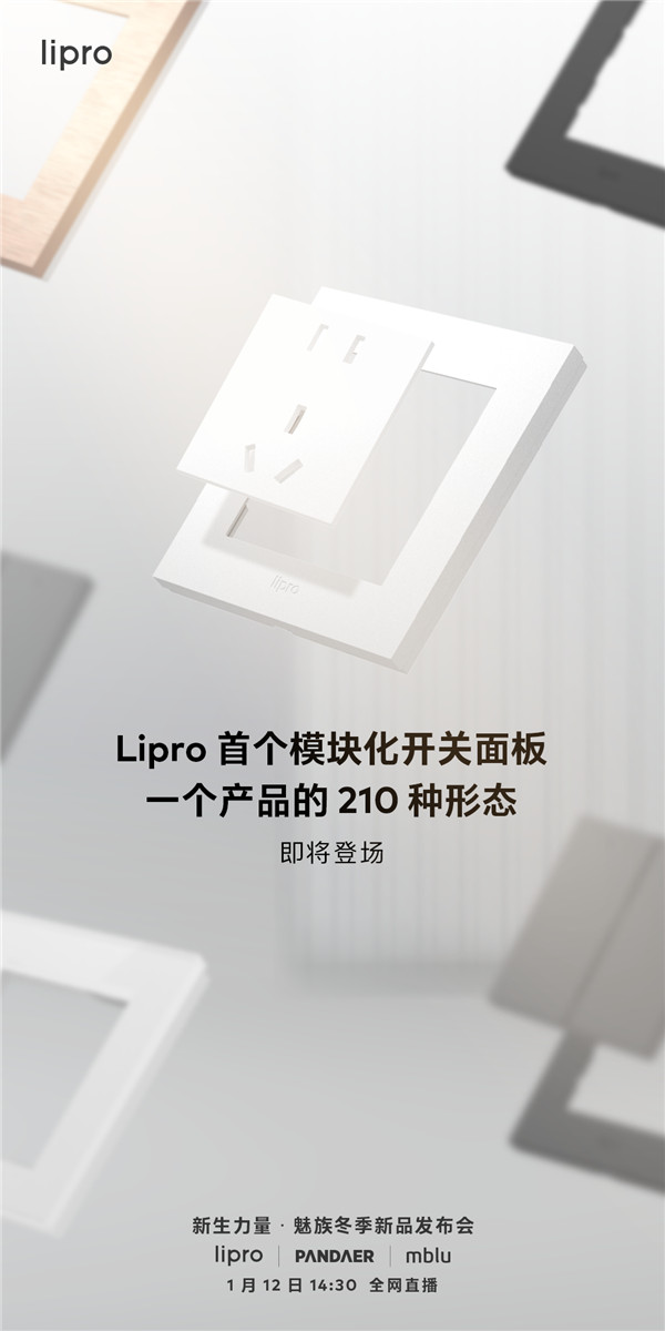 1 月 7 日消息,魅族此前宣布了新生力量 ・ 魅族冬季新品发布会,将在 1 月 12 日 14:30 全网直播。魅族 Lipro ASPCMS社区官网居也将发布新品,3 种_____ × 7 款______ × 10 类______= 210 种搭配组合。Lipro 首个模块化开关面板即将登场,敬请期待。
