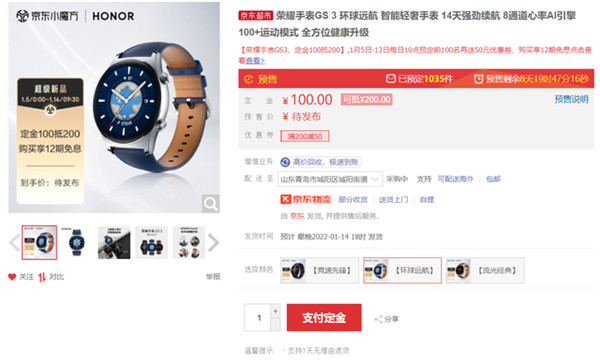 荣耀手表 GS 3 目前已在电商平台开启预售,有“环球远航”、“流光经典”、“竞速先锋” 三款配色,分别对应三种不同的手表风格,将于 1 月 14 日正式开售。