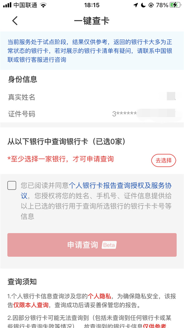 据了解,用户可通过“一键查卡”服务查询名下各商业银行的银行卡数量、银行名称、借贷记属性、卡号的前 4 位后 4 位等信息。