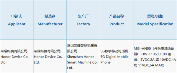 荣耀 Magic V 的型号为 MGI-AN00,支持 11VDC,6A MAX,最高 66W 快充。