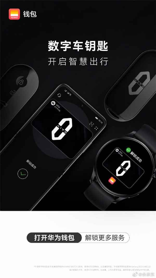 今天余承东在微博表示,华为钱包推出业内首个支持蓝牙 + NFC 二合一的数字车钥匙,它具备蓝牙无感开锁、碰一碰解锁等强大功能,省去了大家携带实体车钥匙不方便、易丢失的麻烦。目前支持 HarmonyOS 2.0 以上的华为手机,手表端则率先支持 HUAWEI WATCH 3 系列,并且后续会有更多华为手表升级支持该功能。当然,它也符合国内 ICCE 标准,满足金融级的安全要求,大家可以放心使用。