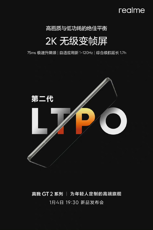 从目前的官方预热来看,真我GT2系列将搭载一块6.7英寸的三星2K柔性屏,采用微缝拼接工艺边框极窄,视觉体验出色;第二代LTPO,自适应刷新1-120Hz,可以实现75ms极速升降频,综合续航延长1.7小时;1000Hz电竞操控引擎,带来realme迄今游戏体验最好的屏幕。