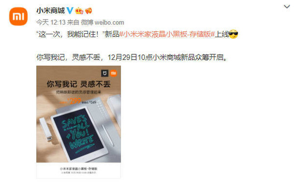 12月28日,小米官方宣布,新品小米米家液晶小黑板-存储版上线!零售价349元,众筹价299元,将于12月29日10点开启众筹。