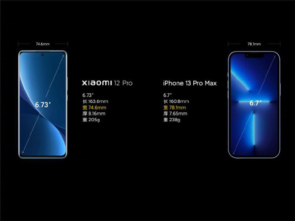 今天上午,小米 CEO 雷军公布了小米 12 Pro 的机身尺寸和重量,与 iPhone 13 Pro Max 进行对比。