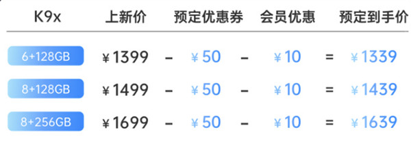 12 月 27 日消息,OPPO 此前预告 K9x 将于 27 日到来,现已公布首发价:6+128G 1399 元,8+128G 1499 元,8+256G 1699 元,但还提供其他的折扣。
