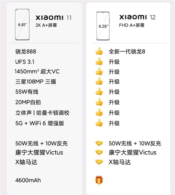 在列出的 6 项升级中,小米 12 搭载了骁龙 8 Gen 1,采用 2600mm^2 超大 VC 面积,采用小米影像大脑全新技术架构、支持 CyberFocus 万物追焦,支持 3200 万高清自拍、原生美肌人像,支持 67W 有线快充、50W 无线快充,支持对称式双扬声器、哈曼卡顿专业调音。