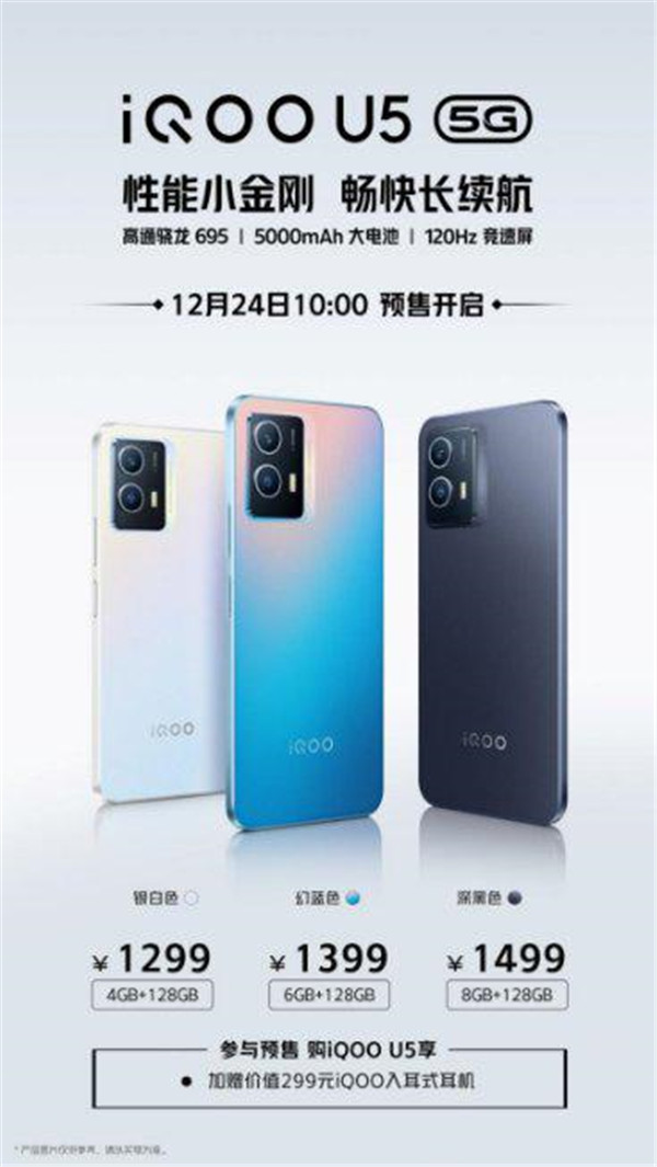 12 月 24 日消息,近日主打中端市场的 iQOO U 系列迎来更新,iQOO U5 正式发布。该机带来了 5000mAh 大电池、6nm 高通骁龙 695 5G 芯片、120Hz LCD 高刷屏、5000 万像素主摄等配置,今日正式开启预售,售价 1299 元起。