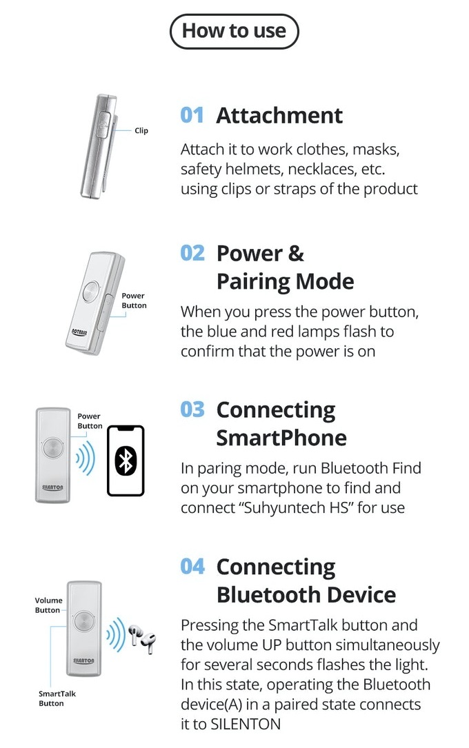 这家韩国科技公司表示,Silenton 收发器可方便夹在衣领、头盔、项链、或靠近嘴边的其它地方,并在音源(比如智能机)和第三方设备(耳机 / 耳塞)搭起蓝牙无线的沟通桥梁。