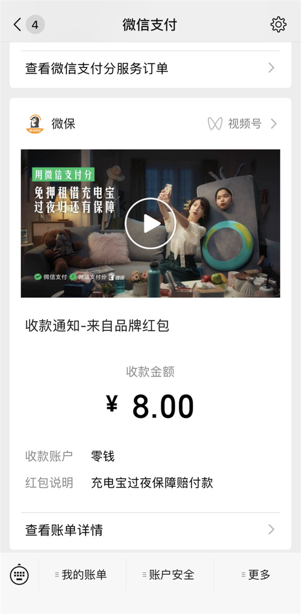 12 月 24 日消息,据微信官方发布,微信支付分联合腾讯微保推出了“充电宝过夜保障”—— 充电宝“过夜”归还可获得 8 块钱赔付,直接到账零钱!