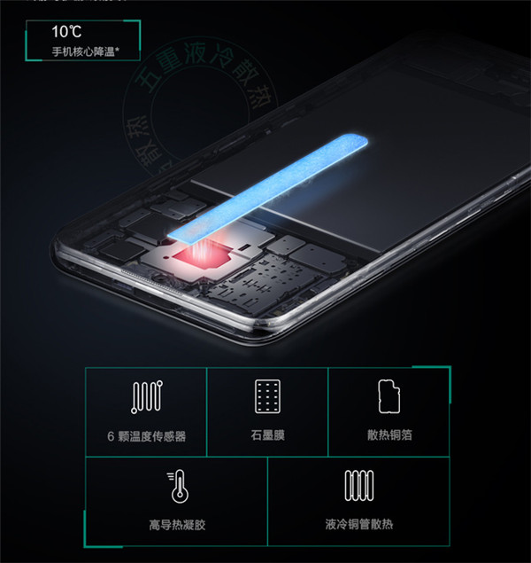 这款手机拥有五重液冷散热系统,内部具有 6 颗温度传感器,配备高导热凝胶、热管,保证游戏稳定性。