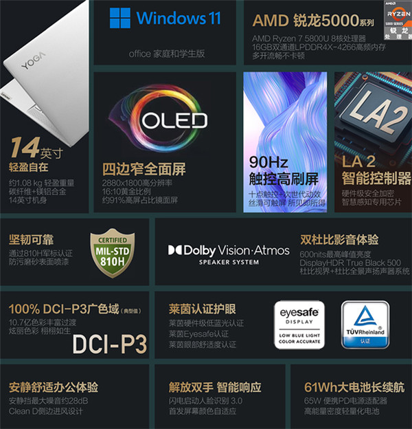 联想 YOGA Pro 14s Carbon 2022 搭载 AMD 锐龙 7 5800U 八核处理器,拥有立体声高低音分频阵列四扬声器,支持杜比全景声音响系统,还配置了联想自研的 LA2 智能嵌入式控制器,可以实现屏幕亮度及色温智能调节、键盘背光灯智能调节、Fn+Q 4.0 散热系统智能调节、硬件级设备加密。