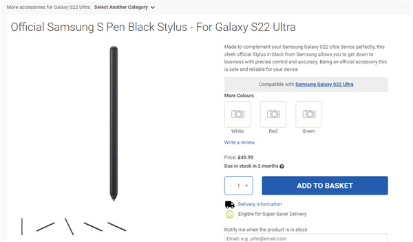 12 月 23 日消息,mobilefun 现上架了一款三星 S Pen 黑色手写笔,宣称适用于 Galaxy S22 Ultra。除去黑色版本外,官方似乎还提供了绿色、红色、白色的版本。