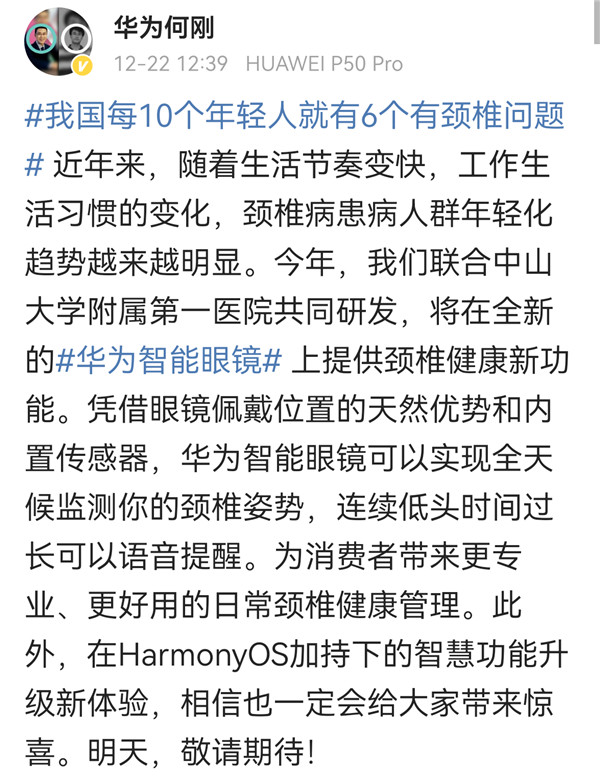 华为何刚今天发微博称,近年来,随着生活节奏变快,工作生活习惯的变化,颈椎病患病人群年轻化趋势越来越明显。今年,我们联合中山大学附属第一医院共同研发,将在全新的华为智能眼镜上提供颈椎健康新功能。