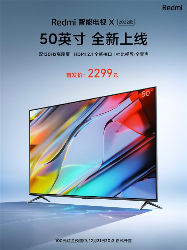 而今天,️Redmi智能电视X 2022款50英寸全新上线,原价2499元,首发价2299元,目前100元订金预售中,将于12月31日20点正式开售。