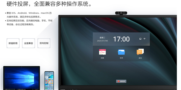T86 Pro针对企业和组织设计,提供一体化智能会议解决方案,采用安卓系统,️产品兼容iOS、安卓、Windows、macOS四大主流操作系统,还支持投屏反控功能,可以在触摸屏上操控电脑、手机、平板等设备。