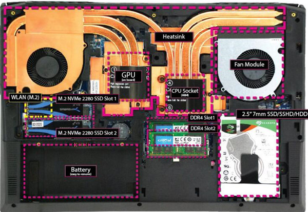 这款笔记本的尺寸为 361x258x32.5mm,重量为 2.6kg 起。笔记本内部结构如下图所示: