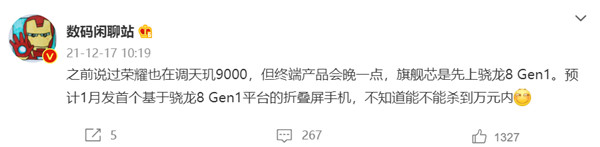 12 月 17 日消息,今日上午,数码博主 @数码闲聊站 爆料称,荣耀也在调试天玑 9000 芯片,但终端产品会晚一些,旗舰芯将先采用骁龙 8 Gen1。荣耀预计明年 1 月发布首个基于骁龙 8 Gen1 平台的折叠屏手机。