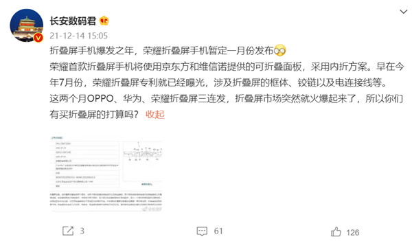 这也与数码博主 @长安数码君 此前爆料的发布时间相同。后者还表示,荣耀首款折叠屏手机将使用京东方和维信诺提供的可折叠面板,采用内折方案。
