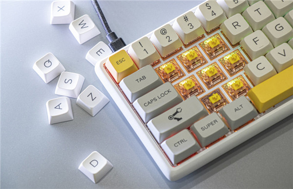这款键盘默认采用佳达隆 PRO 光轴开关,有蓝色、红色、黄色、茶色、白色、黑色轴体可选。键轴的固定片也有多种颜色。产品标配 ABS 材质球形键帽,不透光设计,但是底部具有 RGB 灯光。