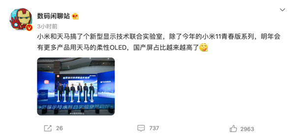 12 月 16 日消息,据数码闲聊站消息,除了今年的小米 11 青春版系列,小米明年会有更多产品用天马的柔性 OLED 屏,国产屏占比会越来越高。