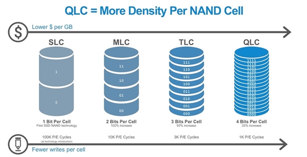 SLC、MLC、TLC、QLC、PLC……NAND闪存的发展大家应该都比较熟悉了,它们代表了每个单元能够存储的比特数据,密度越来越高,容量越来越大,当然可靠性、寿命越来越低。