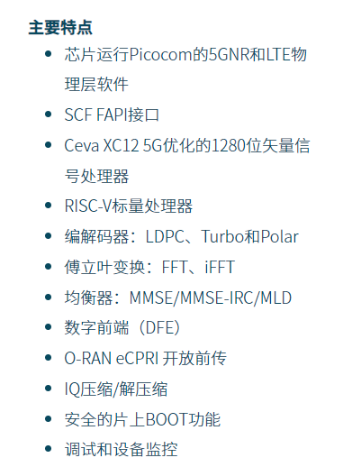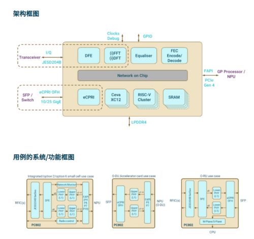 比科奇发布的灵活且低功耗的PC802芯片是业界首款用于优化分布式和一体化小基站的5G芯片。PC802支持4G/5G,它采用FAPI协议(由SCF小基站论坛定义)与MAC层通信,并向MAC层提供物理层服务;PC802 集成了eCPRI接口,来作为前传与 RU 通信,也可以通过集成的JESD204B接口来无缝地对接到无线收发信机。