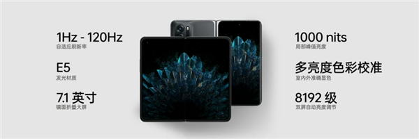 至于展开之后,OPPO Find N则拥有一块7.1英寸大屏幕,并且屏幕素质非常出色,采用E5材质的LTPO OLED屏幕,支持1-120Hz自适应刷新率,支持8192级双屏自动亮度调节,整体参数在常规旗舰中也属于顶级。