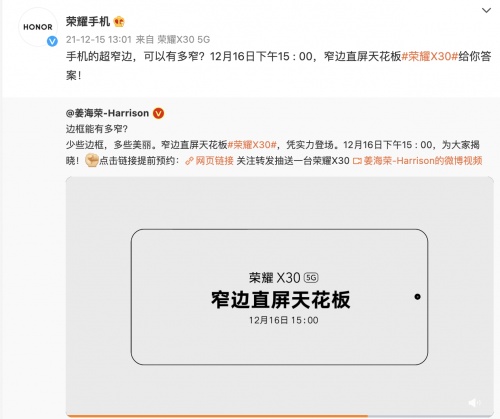 不过荣耀X30的边框和屏占比的具体参数,要等到12月16日发布会上才会揭晓。但结合以往经验看,荣耀X系列一直以来都在坚持打造挡位标杆,在屏幕领域不断突破,为用户带来高品质的产品体验,相信荣耀X30的窄边直屏天花板体验值得大家期待。