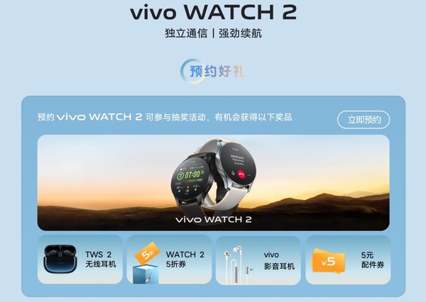 预约vivo WATCH 2可参与抽奖活动,有机会获得TWS 2无线耳机、WATCH 2五折券、vivo影音耳机、5元配件券。同时,还有预售福利,黄金、白银会员先享购,12月22日至25日即可购买,24小时内即可发货,普通会员12月底发货。预售享定金膨胀、晒单返现30元、限量赠送表带、积分抵现最高抵10%、限量赠送健康大礼包。