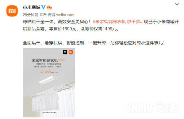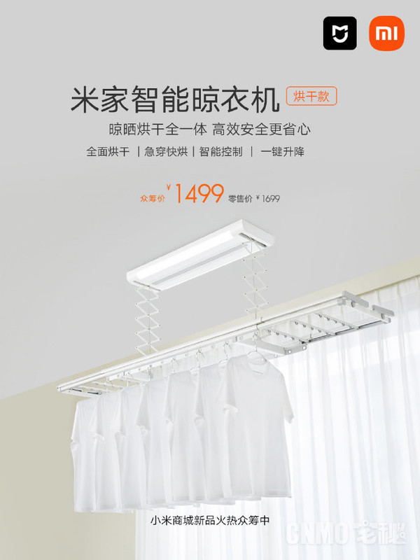 12月15日,小米官方宣布,“晾晒烘干一体”的米家智能晾衣机 烘干款现已在小米商城开启新品众筹,零售价1699元,众筹价1499元。