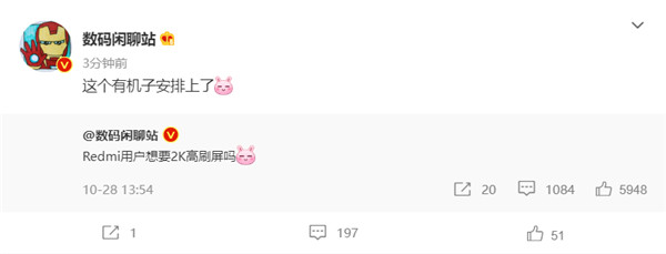 12 月 15 日消息,今日微博博主 @数码闲聊站 爆料,表示小米旗下红米 Redmi 系列手机将首次迎来搭载 2K(1440P)分辨率屏幕的机型。