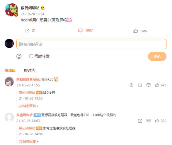 在 10 月 28 日的微博中,微博博主透露,Redmi K50 系列没有搭载 2K 屏。这款新机的型号暂时未知,或许为 Redmi 全新系列。