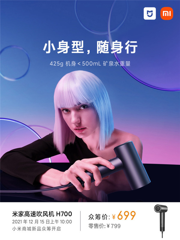 12 月 14 日消息,今日上午,小米宣布推出米家高速吹风机 H700,零售价 799 元,众筹价 699 元,将于 12 月 15 日上午 10:00 开启众筹。