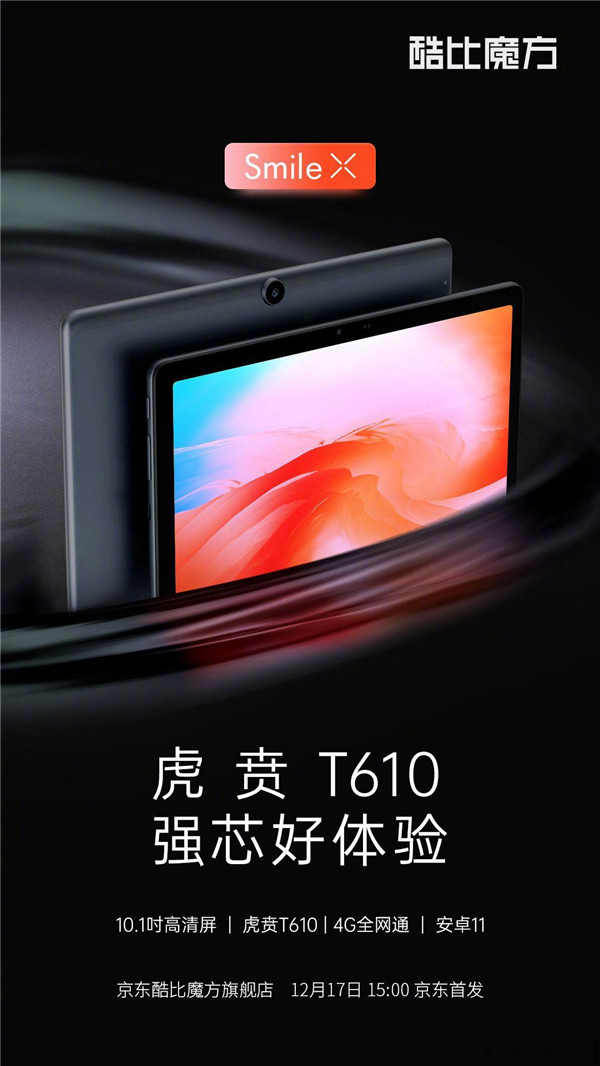 酷比魔方官方近期宣布,酷比魔方 Smile X 来了!支持 4G 全网通,随时随地畅聊娱乐。全芯升级,相比 Smile 1,Smile X 搭载虎贲 T610,性能拉满,快乐翻倍。12 月 17 号首发,敬请期待。