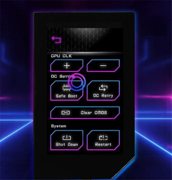 视频中显示,用户可以在触摸屏上快速对主板的参数进行调节,对 CPU 进行超频操作,以及控制主板 BIOS 信息。屏幕可以显示 CPU 温度、环境温度 / 湿度等信息。