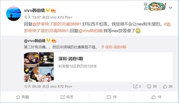 今天下午,一位网友给vivo产品经理韩伯啸留言:“我等NEX快等傻了”。韩伯啸回复:“好东西不怕等,NEX不会让用户失望”。