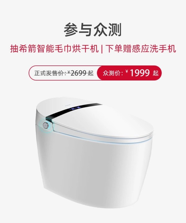 12月10日,希箭大冲力智能马桶在华为商城开启众测,正式发售价2699元起,众测价仅需1999元起。参与众测活动,幸运抽奖赢希箭智能毛巾烘干机,下单赠希箭智能感应泡沫洗手机,预计付款后2天内发货,感兴趣的小伙伴可以关注。