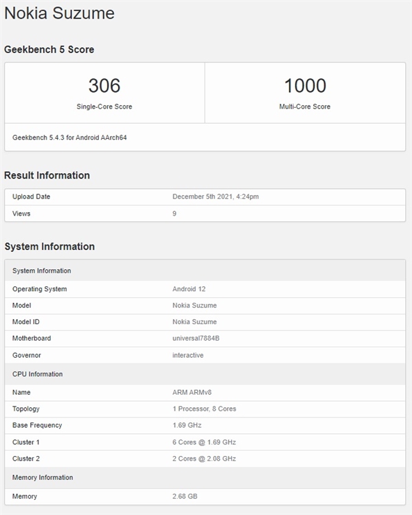 日前,据媒体Nokiamob消息,诺基亚一款型号为Suzume的新机在Geekbench 跑分平台上现身。