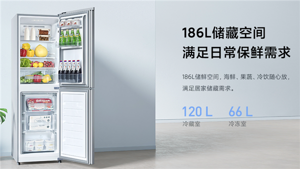 设计上,冰箱宽525mm*深610mm,占地仅0.32㎡,约一把椅子的面积,拥有186L储鲜空间,包括120L冷藏室,66L冷冻室。