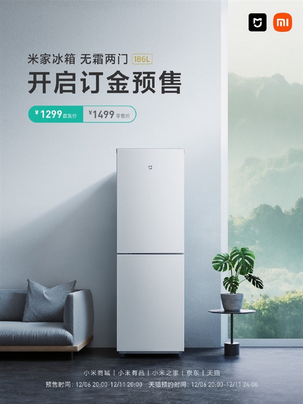 12月6日消息,小米智能生态官微宣布,米家冰箱无霜两门186L开启订金预售,零售价1499元,首发到手价1299元。